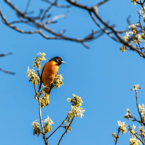 Bright orange oriole feeder offers a built-in ant moat and a buffet of food to feed orioles and other colorful songbirds.