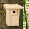 This birdhouse is made of pine wood.